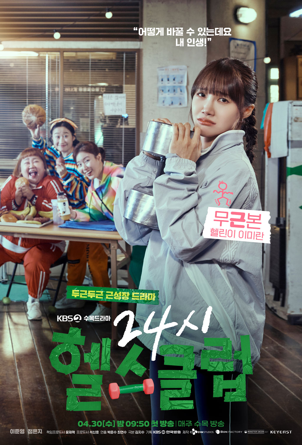 4월 30일부터 KBS2TV에서 <빌런의 나라 후속으로 방영되는 새 드라마〈24시 헬스클럽〉을 소개할게. <24시 헬스클럽>은 헬스장에서 벌어지는 웃음과 감동, 그리고 작지만 확실한 변화들을 그리는 청춘 성장 코믹 드라마야. 정은지, 이준영, 김신영, 홍윤화, 박성연 등 다양한 매력을 가진 배우들이 출연해서 기대를 모으고 있어!