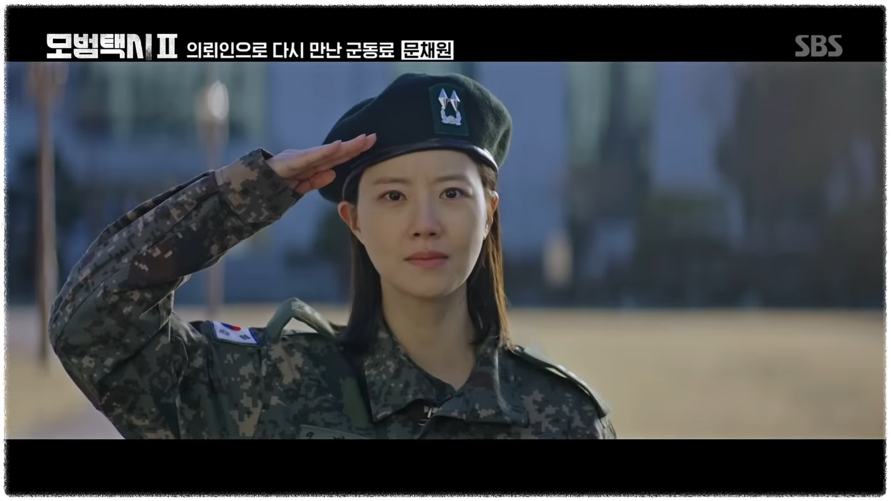 무지개 운수 팀이 금사회 사건을 완벽 해결한 후 1년이 지난 김도기 기사는 이번에는 성폭력 신고 후 2차 가해에 시달리다가 극단적 선택을 한 사건을 조사하게 됩니다. 김도기는 해당부대 감찰과 대위로 들어가게 되는데요, 상부에 신고를 하고 나오다 오미서 중위(문채원)을 만납니다. 문채원 배우는 얼마전 종영한 '법쩐'에서 법무관으로 출연했었죠. 그래서 당연히 이 장면에서 '어?' 하면서 '법쩐'을 떠올리신 분들이 많았을 겁니다.