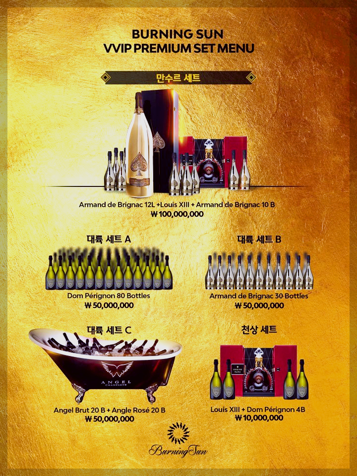버닝썬 메뉴판. 맨 왼쪽 위에 1억원짜리 만수르세트가 있다. 아르망 드 부리냑 샴페인, 루이 13세 코냑 등으로 구성되어 있음.