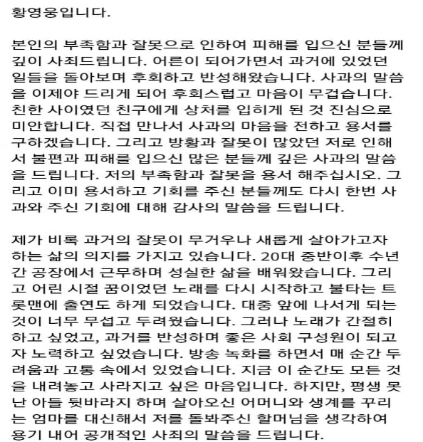 이에 황영웅은 2016년 검찰의 약식 기소에 의한 벌금 50만원 처분을 받았다고 밝히며 공식적으로 사과를 했습니다. 어린시절 잘못을 진심으로 뉘우치고 있으니 다시 한 번 "변화하며 살아갈 기회를 달라"는 요지였죠.