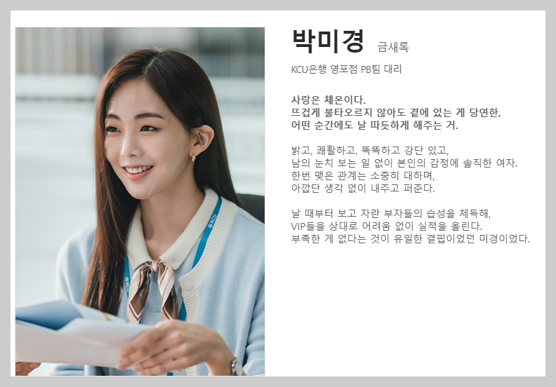 은행 안에서 인기 탑!. 철벽녀 같지만 아픔을 간직한 여자입니다. 그녀가 사랑으로 가면을 벗게 될 날이 올까요.