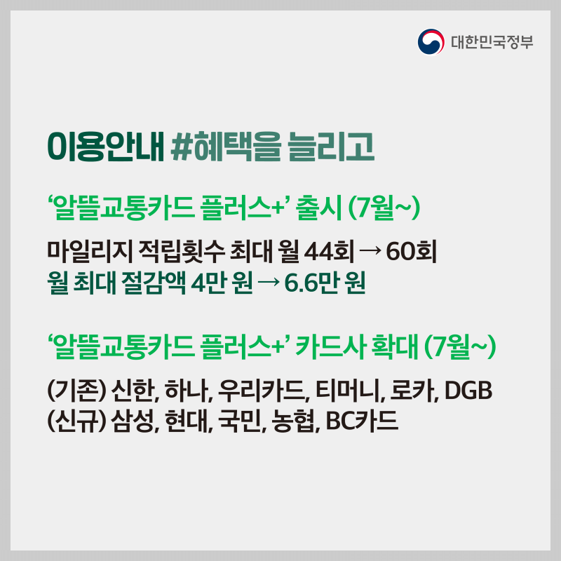 국토교통부는 알뜰교통카드의 혜택을 더욱 확대하겠다고 밝혔습니다. 7월부터 이른바 알뜰교통카드 플러스를 도입하기로 한 건데요, 새로운 카드는 기존에 신한, 우리, 하나, 티머니, 로카, DGB 등 6개 사에 더해 삼성, 현대, 국민, 농협, BC까지 총 11개 카드사에서 발급할 수 있도록 협약을 체결했다고 합니다.