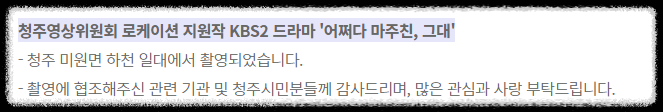 KBS2 드라마 '어쩌다 마주친, 그대'는 청주영상위원회에서 로케이션을 지원했다고 합니다. 청주 미원천에서 촬영되었다는데요, 청주 미원천? 미원천이 어디일까요?