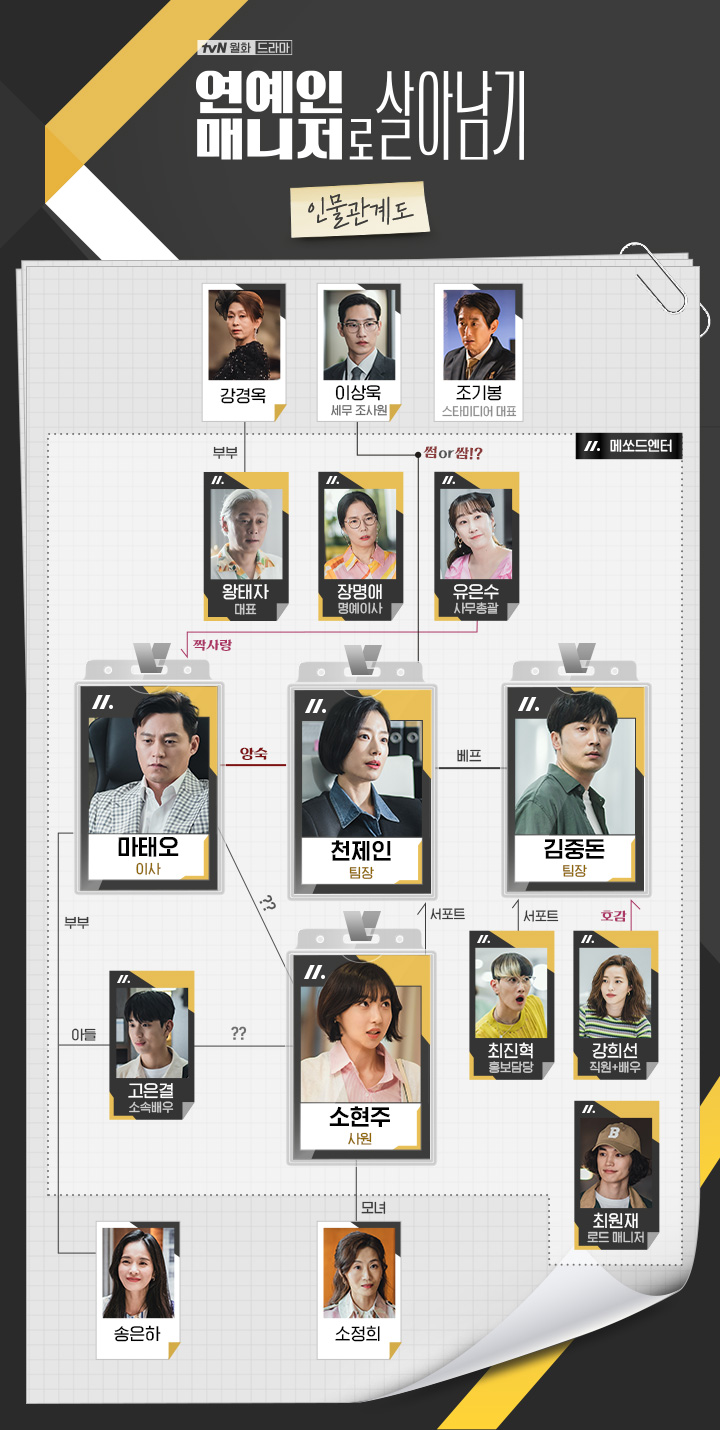 TvN 연예인 매니저로 살아남기는 대한민국 대형 매니지먼트 회사 '메쏘드엔터테인먼트'를 둘러싸고 벌어지는 이야기입니다. 대표의 갑작스런 죽음으로 존폐의 위기를 맞는 메쏘드 엔터. 이사 마태오(이서진)를 비롯한 매니저 및 직원들은 살아남기 위해 안간힘을 씁니다. 그 사이에도 연예인 매니저로서의 서포트를 하고, 사고를 수습하는 일들은 계속됩니다. 마태오 이사와 신입직원 소현주(주현영)와의 관계의 비밀이 밝혀지면서 또다른 갈등이 벌어지죠.