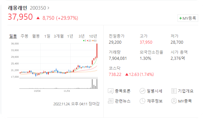 제작사는 '래몽래인'이라고 합니다. 재벌집 막내아들 드라마의 인기에 힘입어 드라마 3회차가 끝난 다음날인 월요일 21일부터 주가가 꾸준히 오르더니 11월 24일 오늘 하루만 30% 가까이 올랐다고 하네요. 와우!!!! 지난해 상장한 회사인데, 공모주 아직 가지고 계신 분 계실까요?