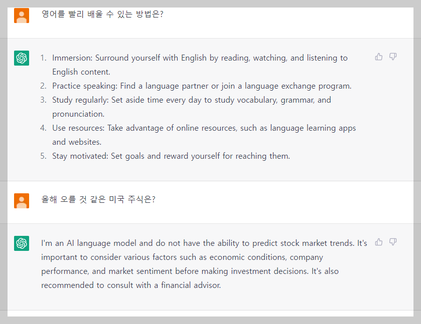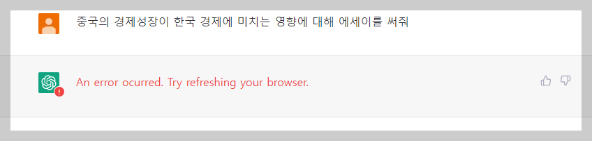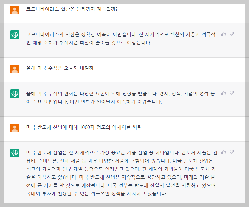 실제로 챗GPT가 무엇을 알고 있는지 궁금해서 다양한 질문을 해 보았습니다. 가끔 에러가 나거나 한글로 물어봤는데 영어로 답하는 등 오류가 생기기도 하고, 질문(명령어) 입력이 잘못되었는지 에세이까지는 어려워보였습니다. 대답은 매우 매끄러운 문장으로 돌아왔습니다.